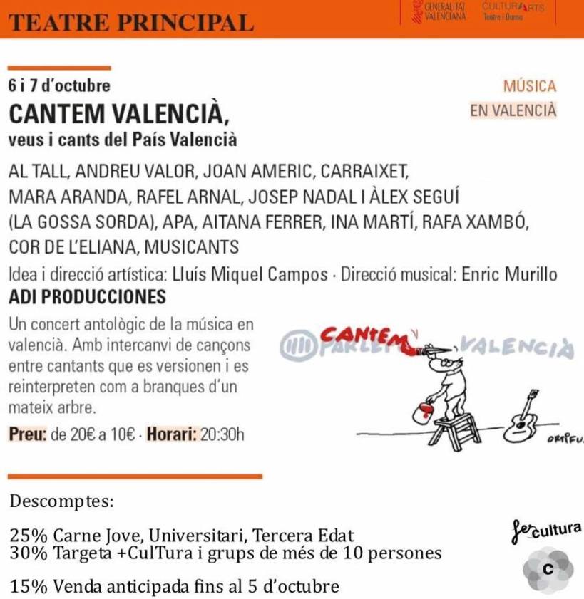 Cantant "Dies de Festa" en directe a l'espectacle "Cantem Valencià" del passat 7 d'Octubre al Teatre Principal de València. https://www.youtube.com/watch?v=CDQVeriAtxA