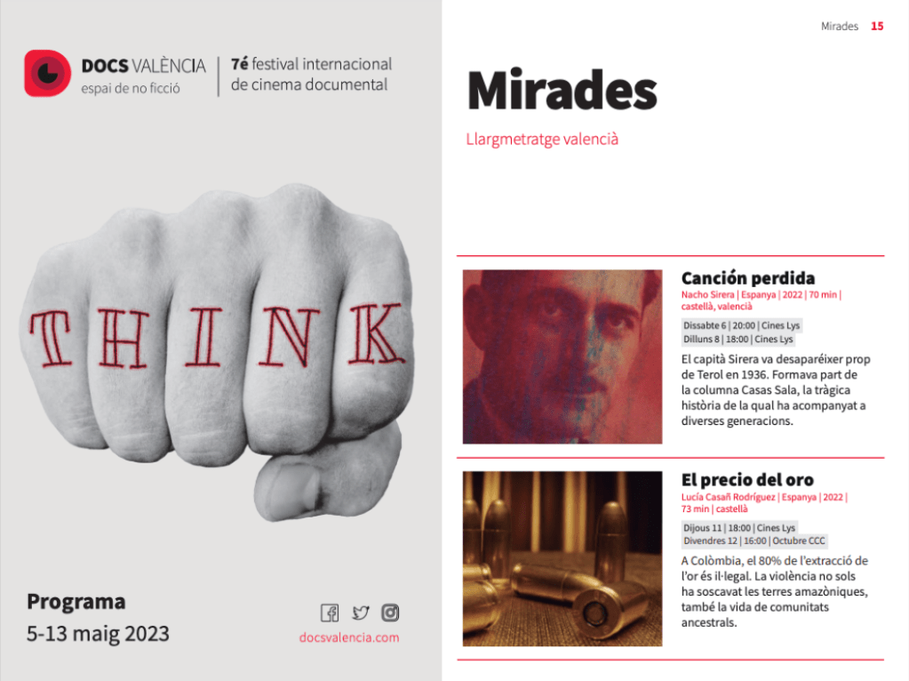 El festival #7DocsValència va anunciar, el passat 25 d’abril, les pel·lícules que conformaran la secció en competència #Mirades, nou films creats en la Comunitat Valenciana que conviden a descobrir el talent local. Entre aquestes nou pel·licules, està el documental “Canción perdida” de Nacho Sirera.