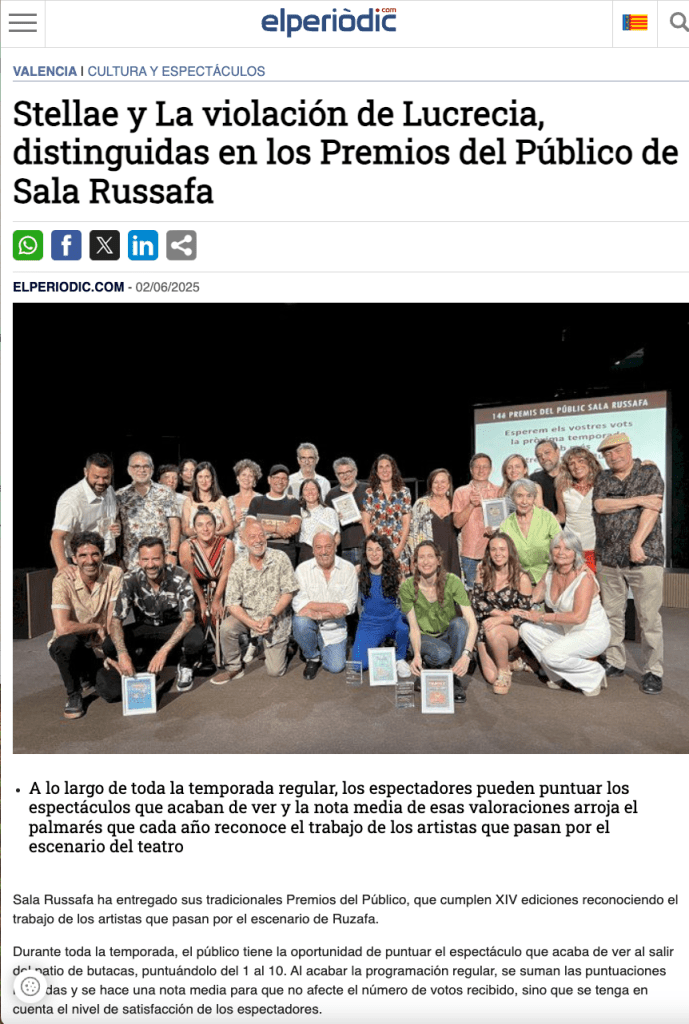 Estem molt emocionades perquè ahir vàrem recollir el guardó d’Espectacle Revelació per ‘Rogles de cançons i misèria’ en el marc dels Premis del Públic de la Sala Russafa. Moltíssimes gràcies i enhorabona a la resta de guardonades i guardonats!