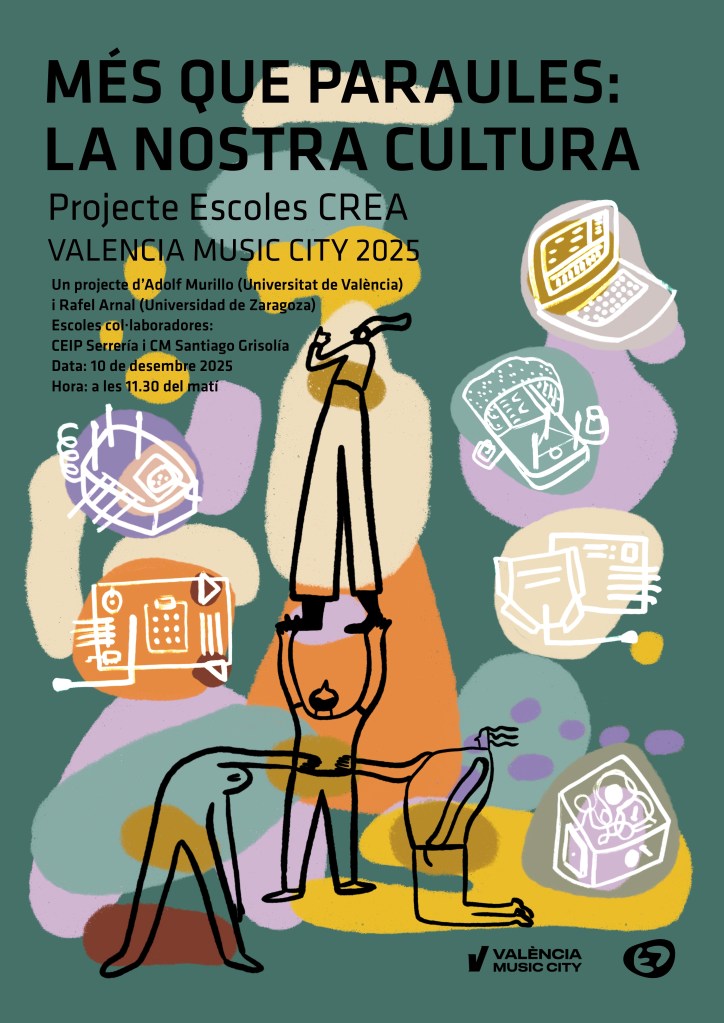 Entre el 15 de setembre i el 31 de desembre de 2025, l’alumnat de 5é de Primària, les seues famílies i el professorat participen en un procés creatiu que combina so, cos, veu, arts visuals i tecnologia. Lluny del model tradicional, Escoles CREA proposa una experiència artística col·lectiva on l’alumnat experimenta amb paisatges sonors, coreografies, performances i composicions inspirades en elements de la cultura valenciana, sota el lema “Més que paraules, la nostra cultura”.