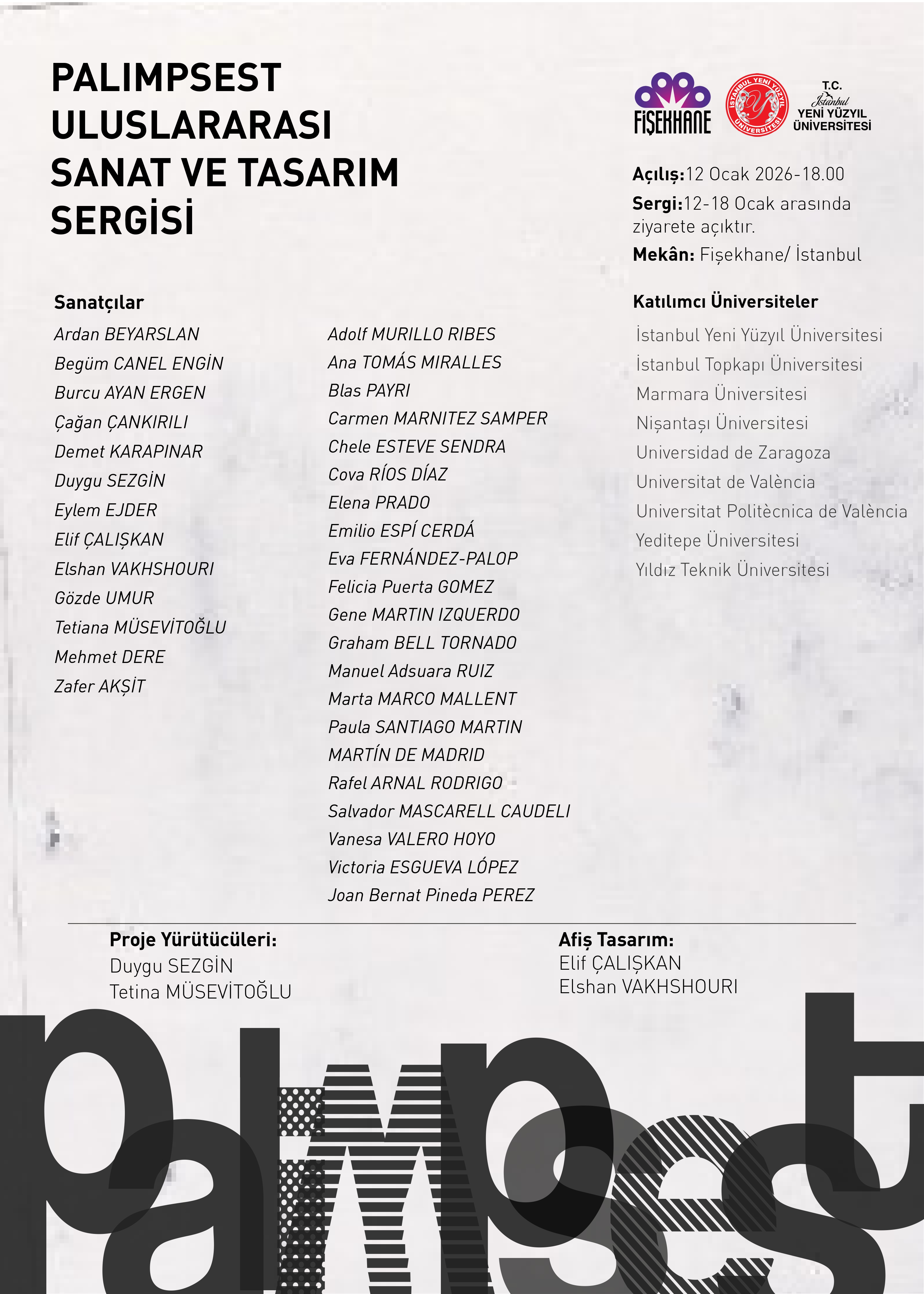 El Projecte Internacional d’Art PALIMPSEST, coordinat per la Universitat İstanbul Yeni Yüzyıl (Turquia) i la Universitat de Saragossa (Espanya), se centra en la producció artística i investigadora en l’àmbit de l’art contemporani, les arts audiovisuals i sonores, i el disseny. La inauguració va tindre lloc el 12 de gener de 2026 a Fişekhane Istanbul.
